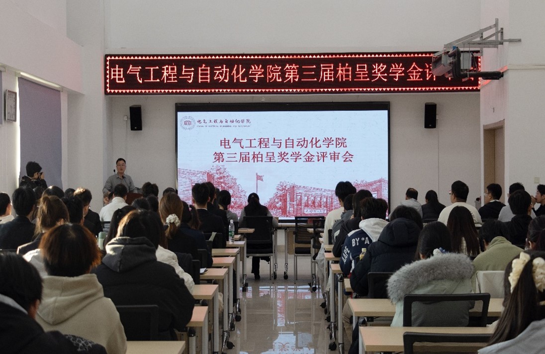 为表彰奖励电气工程与自动化学院优秀学生,激励广大学子勤奋努力、积极向上。11月19日,电气学院在29-454B召开第三届“柏呈奖学金”评审会。校友工作办公室主任王树春、院党委书记张靖、各系教师代表、辅导员出席并担任评委,学生代表担任大众评委,2025级学生代表现场观摩学习。